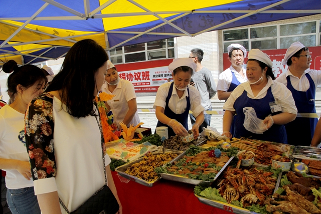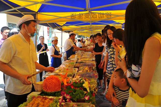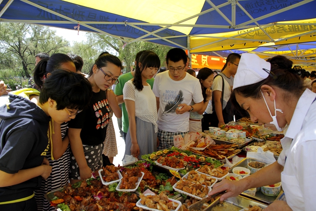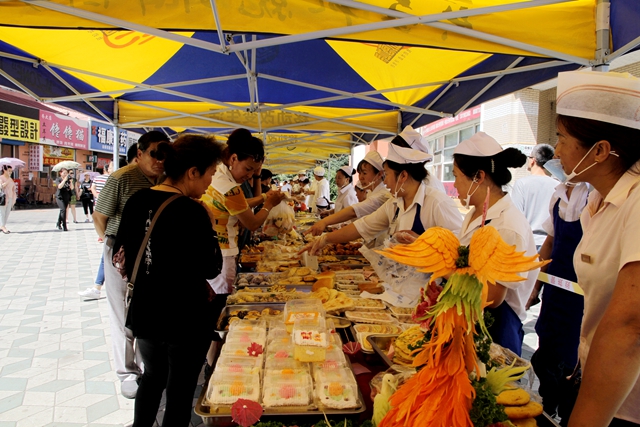 首屆校園美食展銷節(jié),品種多樣,食材豐富,色香味俱佳,除了精美食材雕刻觀賞外,各具特色的主副食品類達(dá)300余種,其中主食類有西點(diǎn)、漢堡、蛋撻等西式甜點(diǎn)和壽司、泡菜等日韓式餐品;小窩頭、黑米面、玉米面發(fā)糕、玉米面餅等粗糧面食;以及山西臊子面、貓耳面、炒刀削面、油潑面等地方特色面食;月餅、棕子等傳統(tǒng)節(jié)日食品;還有油酥糖餅、八裂餅、三刀酥、喇嘛糕、老婆餅、五仁餅、涼糕等傳統(tǒng)糕點(diǎn)。副食類有葡萄雞、香酥雞、羅漢小肚等熟食類食品;醬牛肉、醬雞腿、醬肘子、熏兔、熏鱈雪等熏醬類食品。飲品類有山楂開胃湯、銀耳雪梨湯、現(xiàn)榨果汁等飲品和各種飲料。另有烤串、烤羊排等燒烤類食品,可謂是品類齊全、琳瑯滿目,特色鮮明。