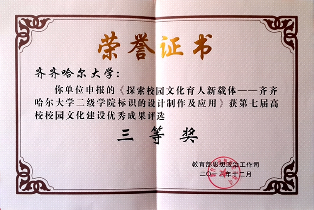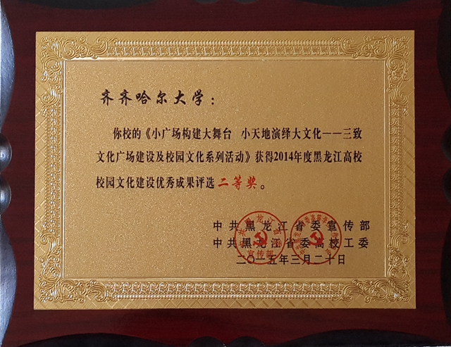 近日,我校申報的校園文化建設(shè)項目《小廣場構(gòu)建大舞臺小天地演繹大文化——三致文化廣場建設(shè)及校園文化系列活動》獲得黑龍江省高校2014年校園文化建設(shè)優(yōu)秀成果評選二等獎,受到黑龍江省委宣傳部、省委高校工委的命名嘉獎。《東北網(wǎng)》設(shè)立專題網(wǎng)頁對獲獎成果進行了展示,《黑龍江日報》對評選活動進行了報道。這是我校繼2013年獲得全國第七屆高校校園文化建設(shè)優(yōu)秀成果三等獎、受到教育部表彰嘉獎后,在校園文化建設(shè)領(lǐng)域獲得的又一項殊榮。