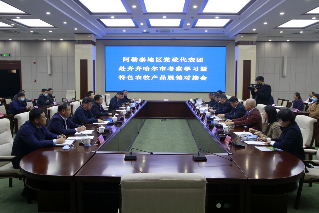10月21日,新疆阿勒泰地區(qū)黨政代表團(tuán)來齊考察學(xué)習(xí)暨特色農(nóng)牧產(chǎn)品展銷對接會在仙鶴賓館舉行。阿勒泰地委副書記、教育工委書記、宣傳部部長竇朝暉,齊齊哈爾市委常委、副市長吳煜等相關(guān)領(lǐng)導(dǎo)和企業(yè)代表出席會議。副校長張樹軍與我校相關(guān)人員應(yīng)邀出席會議。