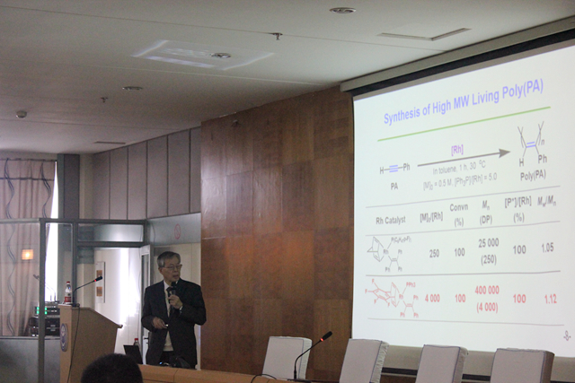 在學(xué)術(shù)報(bào)告中,增田俊夫教授系統(tǒng)闡述了“新型催化劑及定向聚合”、“具有螺旋結(jié)構(gòu)的取代聚苯乙炔聚合物的合成及表征”、“聚苯乙炔高分子氣體分離膜”和“非聚苯乙炔類功能高分子材料”。報(bào)告會(huì)結(jié)束后,增田俊夫教授就相關(guān)問題同與會(huì)師生進(jìn)行了交流互動(dòng)。翌日,賈宏葛博士課題組特邀增田俊夫教授于在材料學(xué)院608室進(jìn)行了高分子膜學(xué)術(shù)交流。