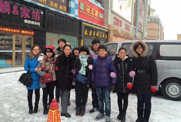 (實(shí)習(xí)學(xué)生在哈爾濱國潤家飾城門前合影)
