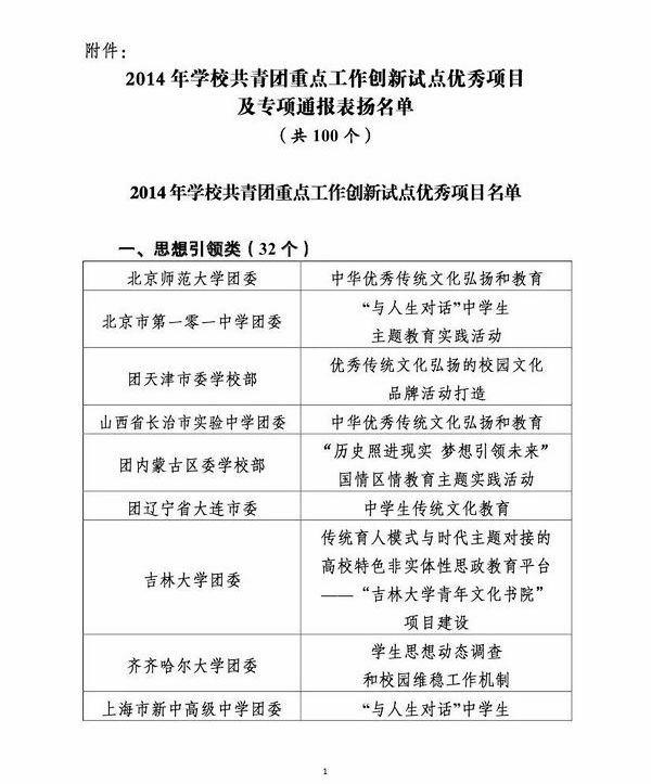 為更好地總結(jié)、運(yùn)用和提煉創(chuàng)新試點(diǎn)工作取得的經(jīng)驗(yàn)成果,進(jìn)一步鞏固提升學(xué)校共青團(tuán)的基礎(chǔ)性戰(zhàn)略性源頭性地位,團(tuán)中央學(xué)校部決定對(duì)2014年學(xué)校共青團(tuán)重點(diǎn)工作創(chuàng)新試點(diǎn)中100個(gè)優(yōu)秀項(xiàng)目進(jìn)行通報(bào)表?yè)P(yáng)。