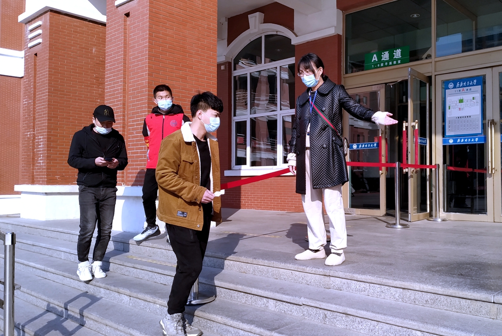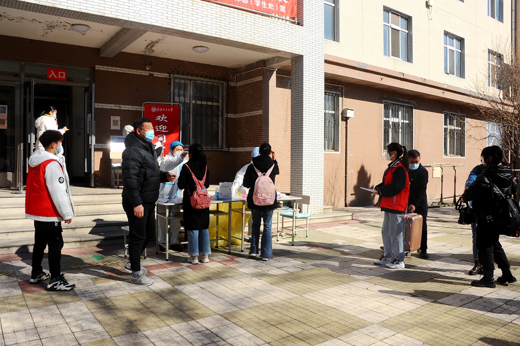 初春的校園,乍暖還寒,工作人員和志愿者們積極為返校學生查驗完美校園健康出入證和龍江健康碼、測量體溫、行李消毒,同學們進入校園后直接返回所在公寓樓附近完成核酸檢測采樣,檢測結果為陰性的同學方可有序活動。