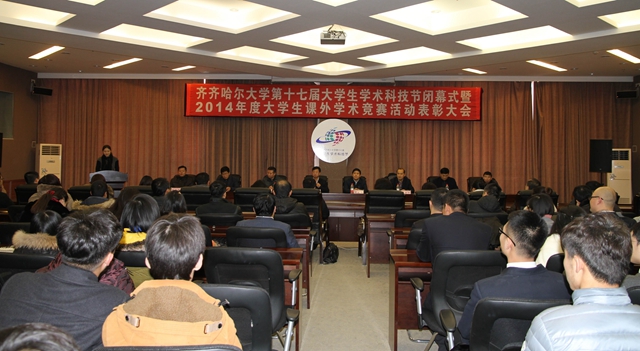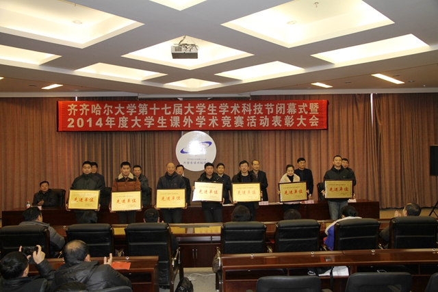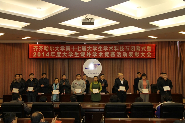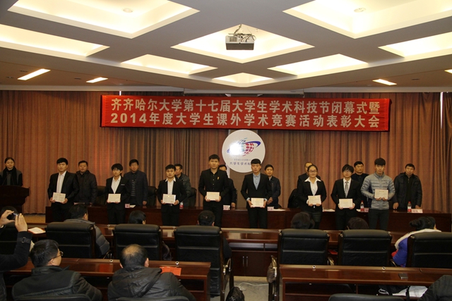 閉幕式上,馬文輝宣讀了《2014年度在全國、全省課外學(xué)術(shù)競賽活動中獲獎學(xué)生和指導(dǎo)教師名單》和《齊齊哈爾大學(xué)2014年度學(xué)生課外學(xué)術(shù)競賽活動先進集體獲獎名單》,姜波宣讀了《齊齊哈爾大學(xué)第十一屆大學(xué)生課外學(xué)術(shù)科技作品競賽終審決賽獲獎名單》和《第九屆學(xué)生社團學(xué)術(shù)科技巡禮月獲獎名單》,劉喜軍宣讀了《第二屆研究生科技創(chuàng)新作品競賽獲獎作品和優(yōu)秀指導(dǎo)教師名單》。