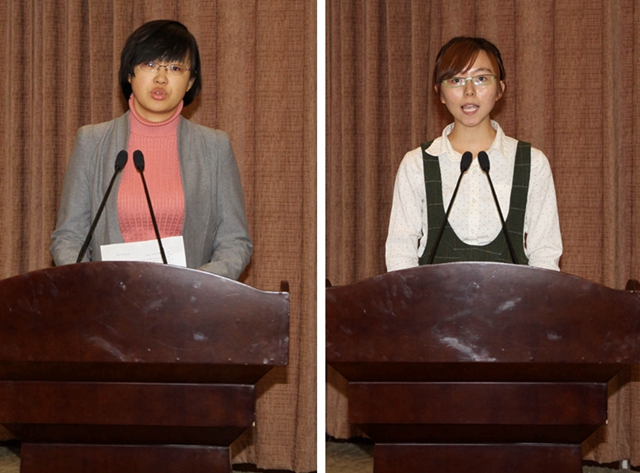 優(yōu)秀指導(dǎo)教師代表苗鳳娟、優(yōu)秀學(xué)生代表孫秀娟分別代表獲獎師生發(fā)言