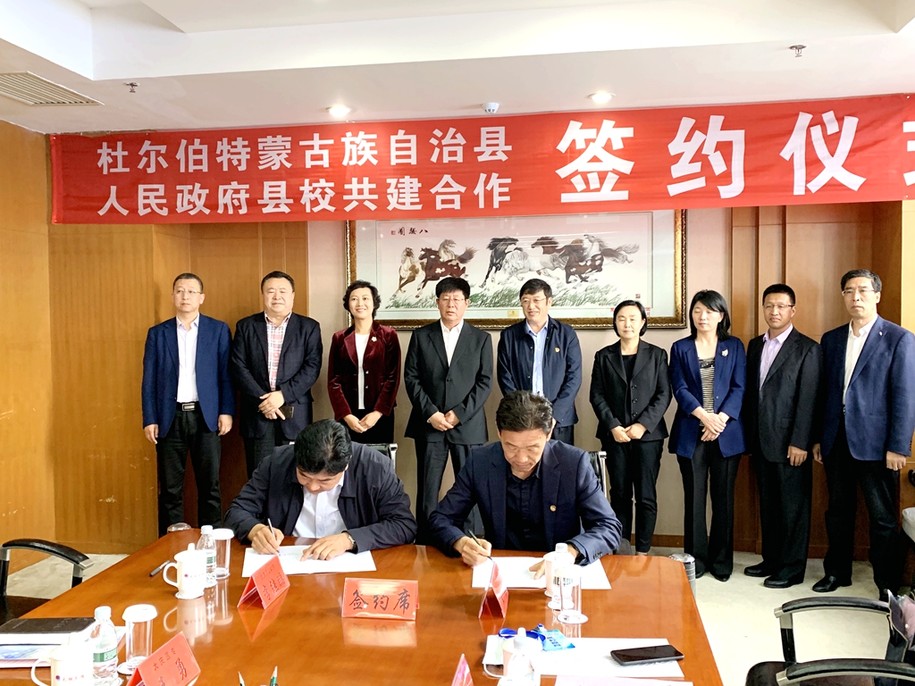 楊國志代表我校與杜爾伯特蒙古族自治縣政府簽訂了縣校合作框架協(xié)議,與黑龍江九陽豆業(yè)有限公司、黑龍江伊品生物科技有限公司簽訂合作協(xié)議并授牌建立實(shí)習(xí)實(shí)訓(xùn)基地。