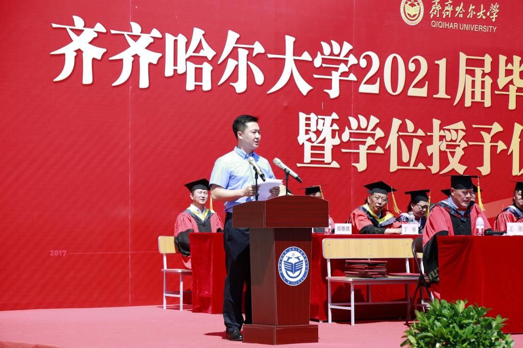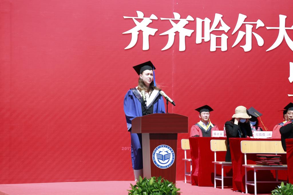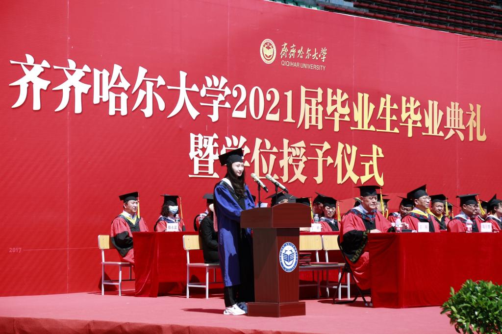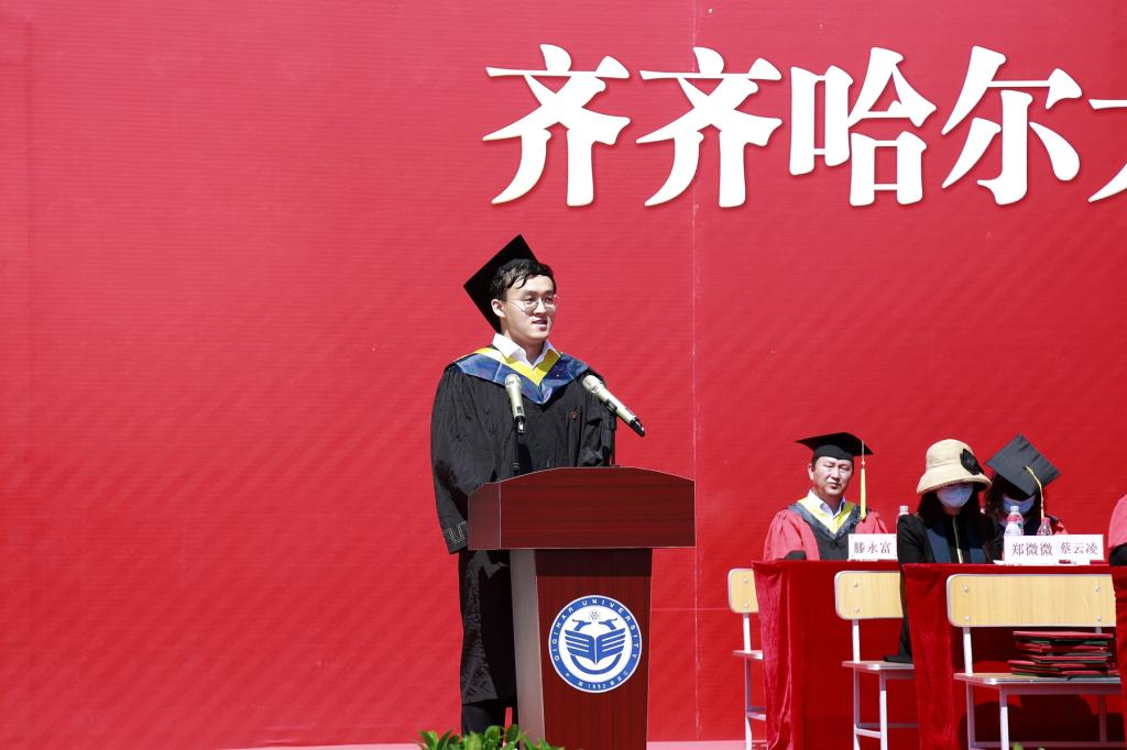 畢業(yè)留學(xué)生代表娜斯佳、碩士畢業(yè)生代表袁倩宇、本科畢業(yè)生代表李鵬喆先后在典禮上發(fā)言,他們深情地表達(dá)了對母校的感恩和不舍,對老師、同學(xué)的感激和祝福,并表示,作為齊大學(xué)子,一定會秉承“養(yǎng)正毓德 精存自生”的校訓(xùn)精神,積極進(jìn)取、努力拼搏,用自己的所學(xué)所能回饋社會、回報母校。