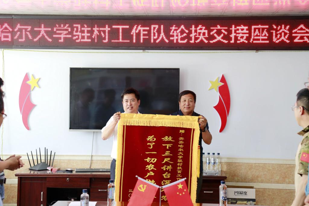 會(huì)上,新任工作隊(duì)員與老隊(duì)員進(jìn)行了工作交接,駐村工作隊(duì)隊(duì)長秦浩波作了表態(tài)發(fā)言。永安村黨支部書記、村委會(huì)主任陳存山代表村民向工作隊(duì)贈(zèng)送錦旗,表達(dá)了對(duì)駐村工作隊(duì)熱心服務(wù)村民、真心為民辦事的認(rèn)可和贊揚(yáng)。
