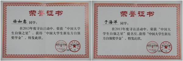 日前,由共青團中央、全國學聯(lián)主辦,中國青年報社、中國高校傳媒聯(lián)盟承辦,新東方教育科技集團協(xié)辦的2013年度尋訪“中國大學生自強之星”活動評選結(jié)果揭曉,我校經(jīng)濟與管理學院學生徐如意獲得“中國大學生自強之星”稱號,同時獲得“中國大學生新東方自強獎學金”5000元;理學院學生于海洋獲得“中國大學生自強之星”提名獎,同時獲得“中國大學生新東方自強獎學金”2000元。
