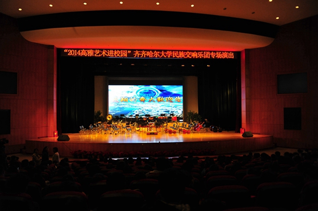 琴瑟傳佳音,雅曲奏和諧。齊齊哈爾大學(xué)民族交響樂(lè)團(tuán)“高雅藝術(shù)進(jìn)校園”專場(chǎng)演出分別在黑龍江建筑職業(yè)技術(shù)學(xué)院文化藝術(shù)中心、哈爾濱理工大學(xué)西區(qū)一號(hào)樓0220報(bào)告廳舉行。在各高校演出前,我校播放了齊齊哈爾大學(xué)視頻宣傳短片《飛翔齊大》,擴(kuò)大了學(xué)校的影響力和知名度。齊齊哈爾大學(xué)民族交響樂(lè)團(tuán)師生用美妙的音樂(lè)、感人的歌聲,傳遞著誠(chéng)摯問(wèn)候,為哈爾濱五所高校的數(shù)千名師生獻(xiàn)上了民族音樂(lè)藝術(shù)的文化盛宴。