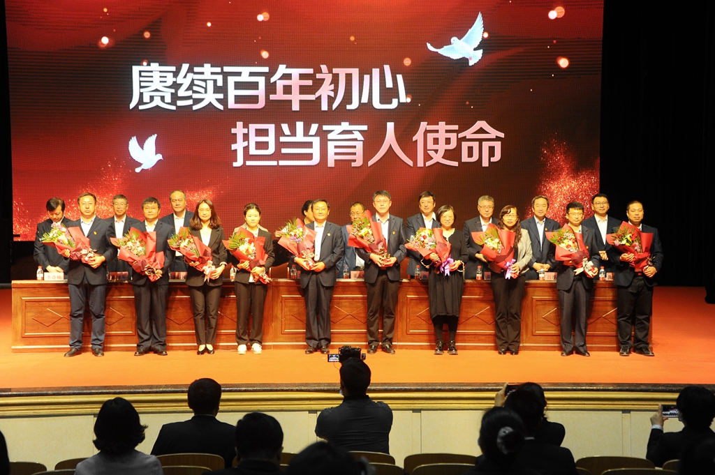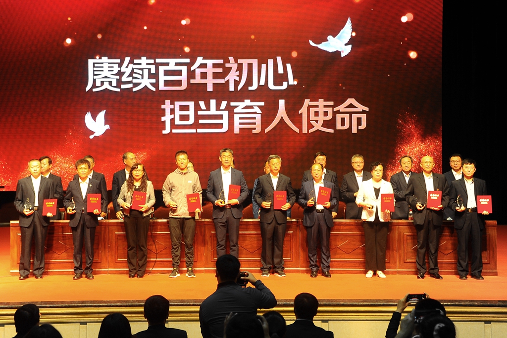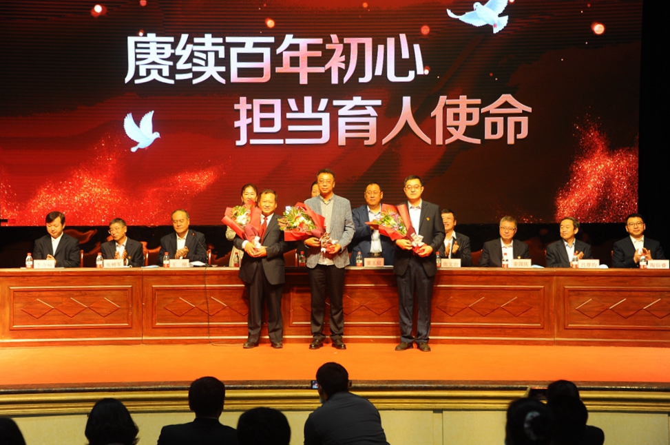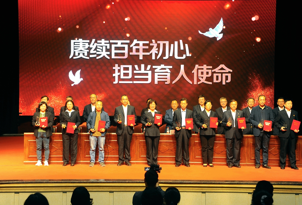 我校第七批“從事教育工作30年”的同志上臺接受表彰