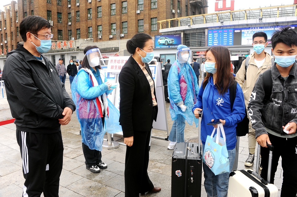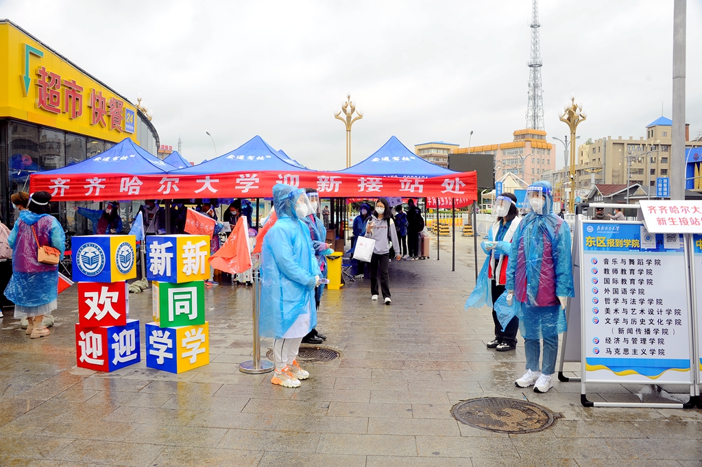 學校在齊齊哈爾火車站、齊齊哈爾南站、站前長途客運站、三百客運樞紐站和齊齊哈爾機場組織了集中接站,現(xiàn)場工作的有關領導、老師、學生志愿者們打著引導牌、揮舞著旗幟,積極有序地迎接剛剛走下火車的新生同學及家長,組織大家及時坐上接站班車,順利抵達學校。學生和家長出站后嚴格執(zhí)行“戴口罩、測溫、掃碼”措施,查驗龍江健康碼、“完美校園”返校碼,無異常情況的同學集體乘車到校直接進入校園;家長由學校專門安排的專車接送到校,為保障校園防疫安全,彌補新生家長不能進入校園的遺憾,今年學校繼續(xù)為新生家長準備了專門的校園觀光車,讓家長在車內瀏覽校園。