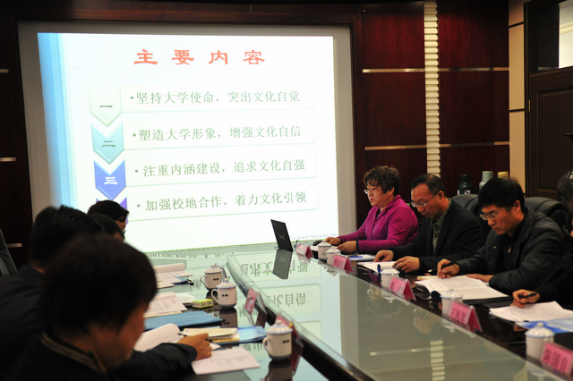 在匯報(bào)會(huì)上,校黨委宣傳部、統(tǒng)戰(zhàn)部部長(zhǎng)王曉梅代表學(xué)校作了題為《以高度的文化自覺加強(qiáng)大學(xué)文化建設(shè)推進(jìn)學(xué)校內(nèi)涵發(fā)展》的專題匯報(bào),深入闡述了我校的校園文化體系,具體從“一個(gè)整體建設(shè)理念、四大識(shí)別系統(tǒng)、七大文化品牌活動(dòng)、四項(xiàng)校地合作成果”展開匯報(bào),重點(diǎn)匯報(bào)了四個(gè)方面的內(nèi)容:“堅(jiān)持大學(xué)使命,突出文化自覺”;“塑造大學(xué)形象,增強(qiáng)文化自信”;“注重內(nèi)涵建設(shè),追求文化自強(qiáng)”;“加強(qiáng)校地合作,著力文化引領(lǐng)”。
