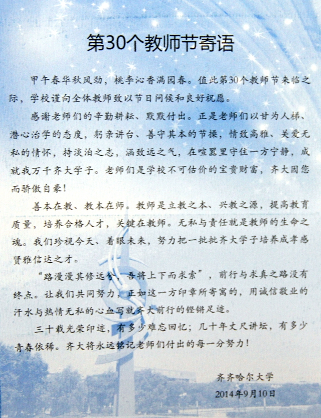 今年9月10日是我國第30個(gè)教師節(jié)。多年來,我校廣大教師全面貫徹黨的教育方針,忠誠黨的教育事業(yè),立德樹人、無私奉獻(xiàn),積極踐行“為人 為學(xué) 為師”的優(yōu)良教風(fēng),為黨的教育事業(yè)和龍江經(jīng)濟(jì)社會(huì)發(fā)展做出了重要貢獻(xiàn),充分展現(xiàn)了胸懷祖國、熱愛人民的博大情懷,學(xué)為人師、行為世范的優(yōu)秀品質(zhì),默默耕耘、無私奉獻(xiàn)的崇高境界,涌現(xiàn)出了一批先優(yōu)模,樹立了人民教師的光輝形象,為美麗齊大爭光增輝。