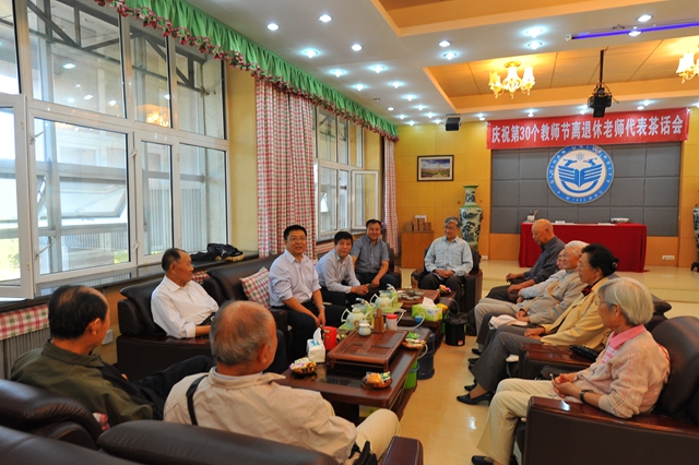 發(fā)布日期:2014-09-10 點擊量:9月9日下午,在我國第30個教師節(jié)來臨之際,根據(jù)學(xué)?!蛾P(guān)于做好慶祝第30個教師節(jié)工作的通知》的安排,校黨委書記李海紅,校黨委常委、工會主席李敏義在工會茶室與離退休老教師、老專家、老同志代表舉行座談會,向他們致以節(jié)日的慰問;離退休工作處處長王志剛,校工會副主席李迎春,離退休工作處副處長李振勇參加了座談會。