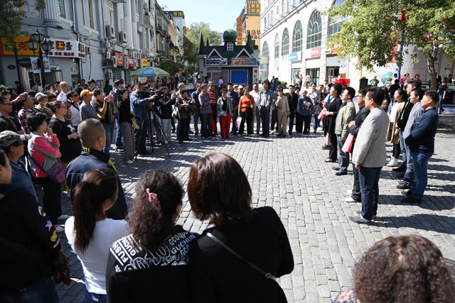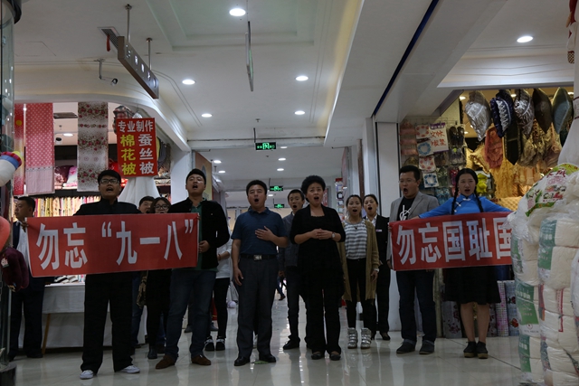 在哈爾濱中央大街金安商城、藝匯家商業(yè)廣場、國潤家飾城,齊大快閃團(tuán)第一組表演了愛國歌曲《松花江上》。