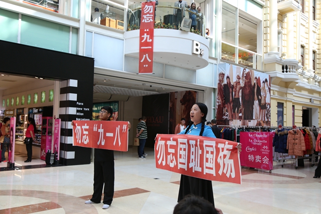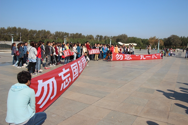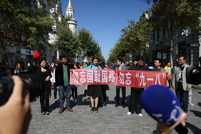 1931年9月18日夜,盤踞在中國東北的日本關(guān)東軍精心策劃、制造了震驚中外的“九一八事變”。中國人民由此揭開十四年抗戰(zhàn)的偉大愛國行動(dòng)。今年是紀(jì)念“九一八事變”83周年。為了警示人們勿忘國恥、振興中華,大力弘揚(yáng)社會(huì)主義核心價(jià)值觀,齊齊哈爾大學(xué)快閃團(tuán)從2014年9月18日9時(shí)18分開始,分別在哈爾濱、齊齊哈爾兩地開展了一次以“勿忘九一八,勿忘國恥國殤,踐行社會(huì)主義核心價(jià)值觀”為主題的“快閃”活動(dòng)。