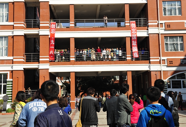 我校師生的“快閃行動(dòng)”受到了現(xiàn)場市民、師生的熱切關(guān)注和積極回應(yīng)。一名在廣場上圍觀的觀眾表示:“9?18,中國人刻骨銘心,愛國情感涌流。在廣場上自發(fā)地高唱愛國歌曲,感覺特別新鮮。這些愛國歌曲在今天這樣一個(gè)特別的日子聽來,是如此的讓人動(dòng)容!”