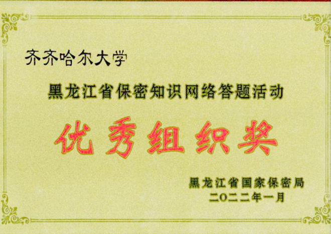 同期,在黑龍江省國(guó)家保密局舉辦的黑龍江省保密知識(shí)網(wǎng)絡(luò)答題活動(dòng)中,我校2萬(wàn)余師生踴躍參與答題活動(dòng),取得優(yōu)異成績(jī),經(jīng)活動(dòng)領(lǐng)導(dǎo)小組評(píng)議,我校榮獲全省“優(yōu)秀組織獎(jiǎng)”。