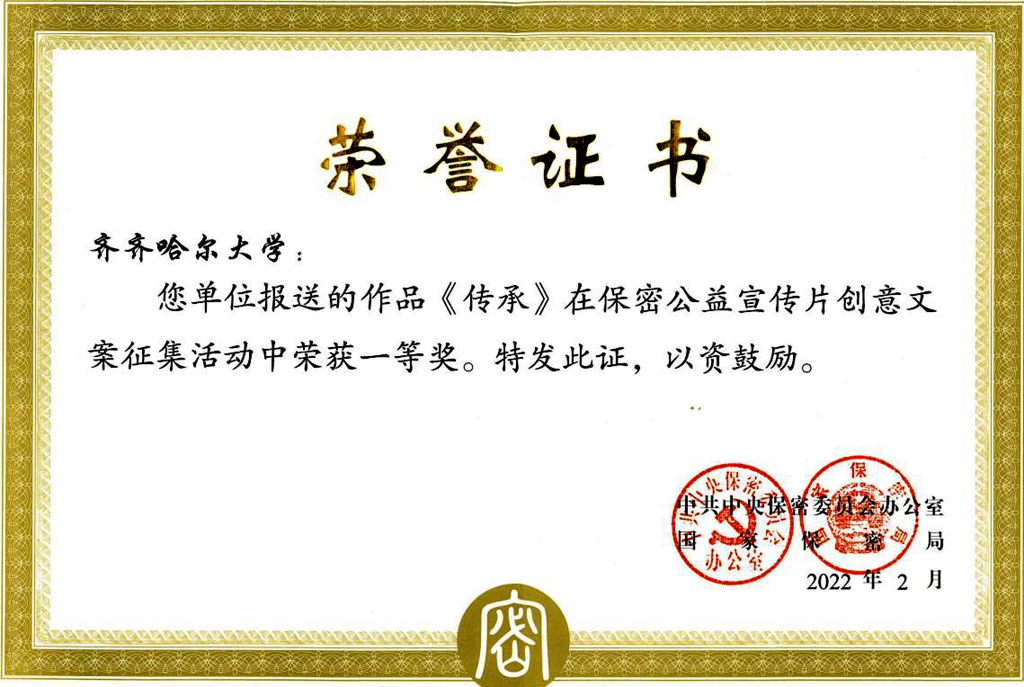 近日,中共中央保密委員會(huì)辦公室、國(guó)家保密局公布保密公益宣傳片創(chuàng)意文案征集活動(dòng)獲獎(jiǎng)作品,我校喜獲佳績(jī),由文學(xué)與歷史文化學(xué)院(新聞傳播學(xué)院)教師陳光指導(dǎo)的《傳承》榮獲全國(guó)一等獎(jiǎng)。據(jù)悉,全國(guó)共有十部作品榮獲一等獎(jiǎng),黑龍江省僅兩所高校獲此殊榮。