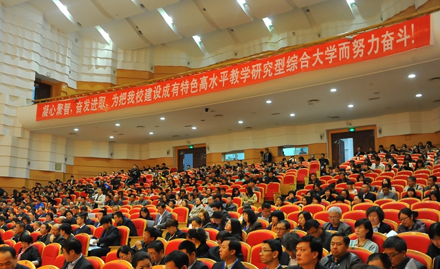 他指出,2012年4月,我校召開了第二屆教職工代表大會第二次會議。二屆二次教代會以來,學校認真貫徹黨的十八大、十八屆二中、三中全會精神,勝利召開了第一次黨代會,開展了黨的群眾路線教育實踐活動。學校認真貫徹落實“十二五”發(fā)展規(guī)劃,大力實施“質量立校、人才強校、特色興校、文化鑄?!卑l(fā)展戰(zhàn)略,圓滿完成了60周年校慶等各項工作,全力推進高水平大學建設。兩年來,在上級主管部門的正確領導下,學校黨政領導班子帶領全校師生員工求真務實,搶抓機遇,堅持以人才培養(yǎng)為中心、以學科建設為龍頭、以師資隊伍建設為重點,緊緊依靠全校教職員工,深化教育教學改革,拓寬發(fā)展思路,創(chuàng)新發(fā)展理念,轉變發(fā)展方式,優(yōu)化發(fā)展路徑,破解發(fā)展難題,推進和諧校園建設,學校的各項事業(yè)取得了眾多歷史性突破,為學校高水平大學建設奠定了堅實的基礎。具體體現(xiàn)為:成功舉辦了60年校慶;人才培養(yǎng)質量穩(wěn)步提高;科學研究能力持續(xù)提升;服務社會能力不斷增強;文明單位和文化內涵建設不斷深化;師資隊伍建設取得新成績;學科專業(yè)建設扎實推;學生教育管理工作水平不斷提升;對外合作交流不斷加強;綜合管理服務工作邁上新臺階;民生工作扎實推進;黨建和思想政治工作水平不斷提高。