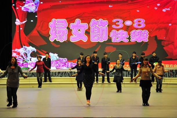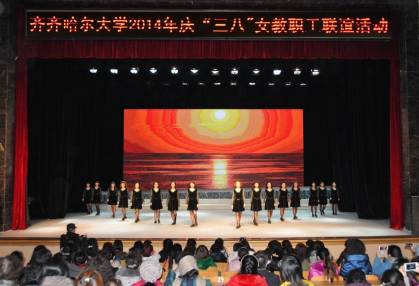 慶祝活動(dòng)精彩不斷,斗智斗勇的撲克比賽,活躍身心、增強(qiáng)體質(zhì)的跳繩比賽,具有民族特色的謎語長廊使女教工們放松了身心,愉悅了心情,陶冶了情操。妙趣橫生的比賽不乏緊張激烈,但更多的是她們開心的笑聲和歡樂的喝彩。形式多樣,內(nèi)容豐富的文藝娛樂演出,更是把本次的慶?;顒?dòng)推向高潮?;顫姎g快、情趣盎然的藏族舞蹈,引人捧腹、搞笑幽默的三句半,熱情洋溢、重溫經(jīng)典的歌曲聯(lián)唱,激情四射、活力綻放的踢踏舞不時(shí)贏得了觀眾的陣陣喝彩,演出在音樂與舞蹈學(xué)院全體女教師一首氣勢恢宏的《紅色娘子軍軍歌》中圓滿落幕。