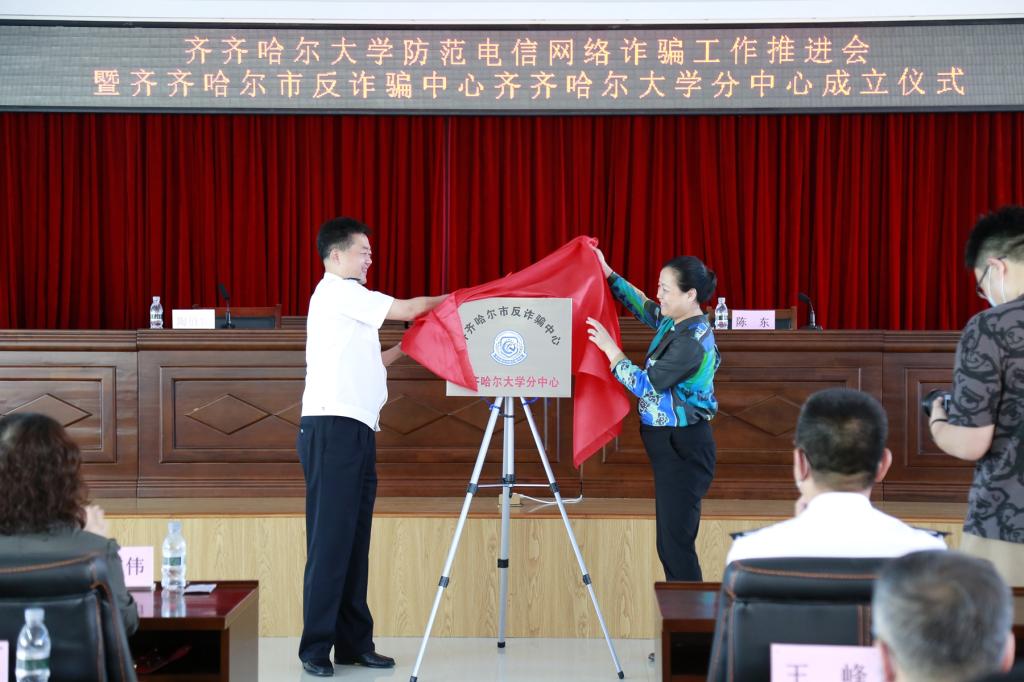 校黨委書記陳桂芝與副市長陳東分別代表校地雙方在成立儀式上共同為齊齊哈爾市反詐騙中心齊齊哈爾大學分中心揭牌。