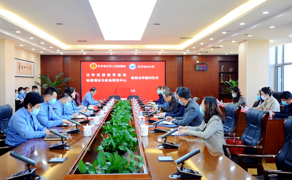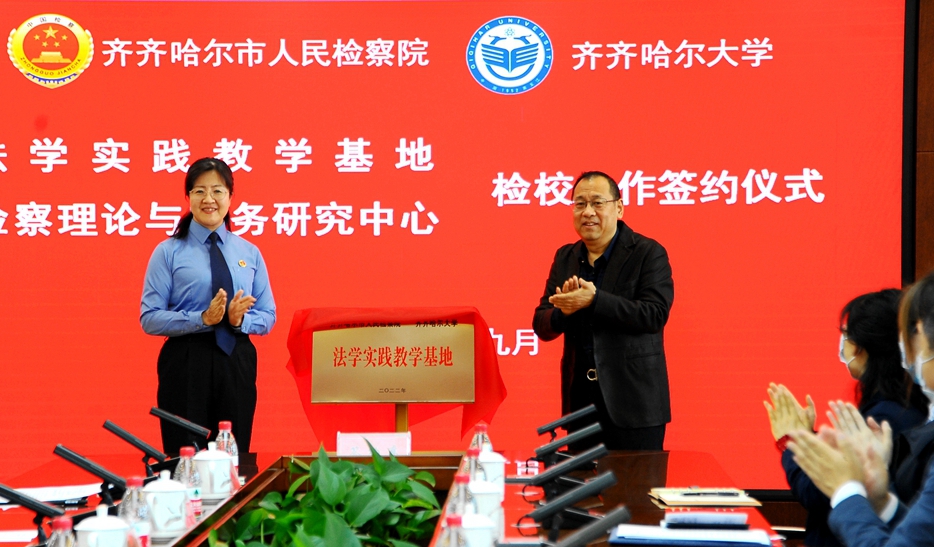 9月28日下午,齊齊哈爾大學(xué)與齊齊哈爾市人民檢察院校檢合作簽約暨“齊齊哈爾大學(xué)法學(xué)實踐教學(xué)基地”“齊齊哈爾大學(xué)檢察理論與實務(wù)研究中心”揭牌儀式在市檢察院舉行。齊齊哈爾市人民檢察院黨組書記、檢察長曲立新及市檢察院領(lǐng)導(dǎo)班子成員,我校校長董玉庭、副校長李奇楠出席儀式,市檢察院中層正職以上干警,我??蒲刑?、教務(wù)處、哲學(xué)與法學(xué)學(xué)院負責(zé)人以及哲學(xué)與法學(xué)學(xué)院部分教師代表參加儀式。儀式由市檢察院黨組成員、政治部主任李文新主持。