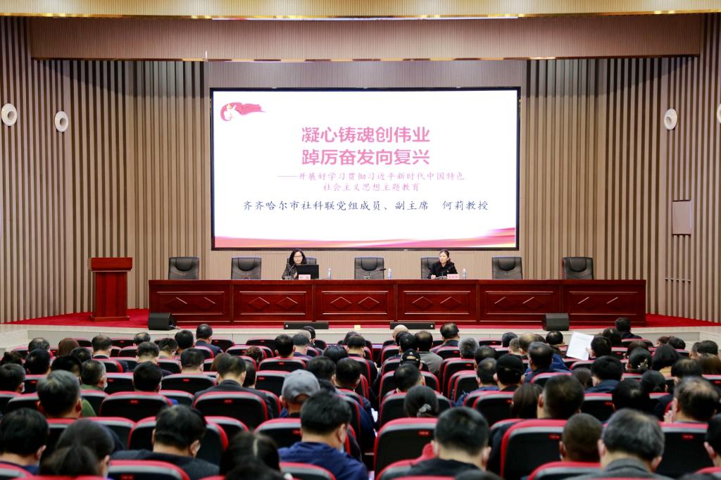開班式后,齊齊哈爾市社科聯(lián)黨組成員、副主席何莉教授以《凝心鑄魂創(chuàng)偉業(yè)踔厲奮發(fā)向復(fù)興—開展好學(xué)習(xí)貫徹習(xí)近平新時(shí)代中國特色社會(huì)主義思想主題教育》為題為全校副處級(jí)以上領(lǐng)導(dǎo)干部作了專題講座。