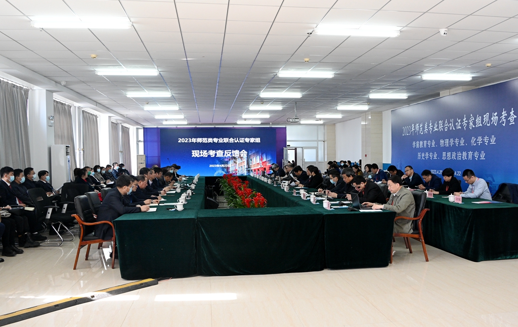4月22日上午,學(xué)校在東區(qū)圖書館八樓報告廳召開2023年師范類專業(yè)聯(lián)合認(rèn)證專家意見反饋會。專家組聯(lián)合大組長兼學(xué)前教育專業(yè)認(rèn)證專家組組長齊魯師范學(xué)院林松柏教授、化學(xué)專業(yè)認(rèn)證專家組組長河南師范大學(xué)陳廣文教授、物理學(xué)專業(yè)認(rèn)證專家組組長東北師范大學(xué)李金環(huán)教授、歷史學(xué)專業(yè)認(rèn)證專家組組長浙江工商大學(xué)施建祥教授、思想政治教育專業(yè)認(rèn)證專家組組長華南師范大學(xué)王建平研究員以及五個師范類專業(yè)認(rèn)證專家組全體成員,我校領(lǐng)導(dǎo)班子成員出席會議,相關(guān)職能部門及單位負(fù)責(zé)人、參與認(rèn)證專業(yè)所在學(xué)院班子全體成員及參評專業(yè)負(fù)責(zé)人參加會議。會議由林松柏主持。
