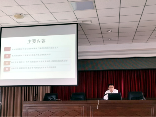 5月24日下午,校工會(huì)主席、黨委常委陶佰睿以《學(xué)思踐悟習(xí)近平總書記關(guān)于總體國(guó)家安全觀的重要論述 奮力創(chuàng)建平安校園》為題,從深刻認(rèn)識(shí)推進(jìn)國(guó)家安全體系和能力現(xiàn)代化的重大戰(zhàn)略意義、扎實(shí)推進(jìn)新時(shí)代國(guó)家安全體系和能力現(xiàn)代化建設(shè)、深入貫徹黨的二十大關(guān)于推進(jìn)國(guó)家安全體系和能力現(xiàn)代化的戰(zhàn)略部署、堅(jiān)持用總體國(guó)家安全觀引領(lǐng)和推進(jìn)高質(zhì)量平安校園建設(shè)四個(gè)方面進(jìn)行詳細(xì)闡述。強(qiáng)調(diào)全校師生要進(jìn)一步要提高政治站位,深刻領(lǐng)會(huì)總體國(guó)家安全觀的豐富內(nèi)涵和實(shí)踐要求,堅(jiān)決貫徹落實(shí)黨中央和省委關(guān)于安全工作的決策部署,把維護(hù)校園安全貫穿辦學(xué)治校各方面全過程,確保師生生命財(cái)產(chǎn)安全,為建設(shè)有特色高水平應(yīng)用型綜合大學(xué)提供安全穩(wěn)定環(huán)境。