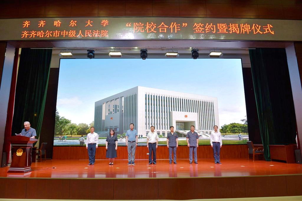 為進一步深化校院合作共建,促進法學(xué)理論與司法實踐銜接融合,推動高校與法院的優(yōu)勢互補、相互協(xié)作,7月5日上午,我校與齊齊哈爾市中級人民法院“校院合作”簽約暨“齊齊哈爾大學(xué)法學(xué)實踐教學(xué)基地”“齊齊哈爾大學(xué)審判理論與實務(wù)研究基地”揭牌儀式在齊齊哈爾市中級人民法院舉行。副校長李奇楠,齊齊哈爾市中級人民法院黨組書記、院長朱衛(wèi)國,齊齊哈爾市中級人民法院黨組副書記、常務(wù)副院長李國軍出席儀式;齊齊哈爾市中級人民法院相關(guān)工作負責人,我校教務(wù)處、科研處、哲學(xué)與法學(xué)學(xué)院相關(guān)負責人參加儀式。儀式由李國軍主持。