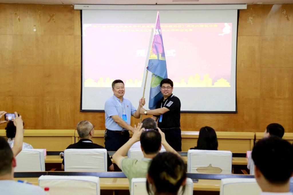 李杰在閉幕式上宣布了下一屆競(jìng)賽承辦單位,王志剛教授代表學(xué)校向大慶師范學(xué)院副院長(zhǎng)殷亞杰交接賽旗。