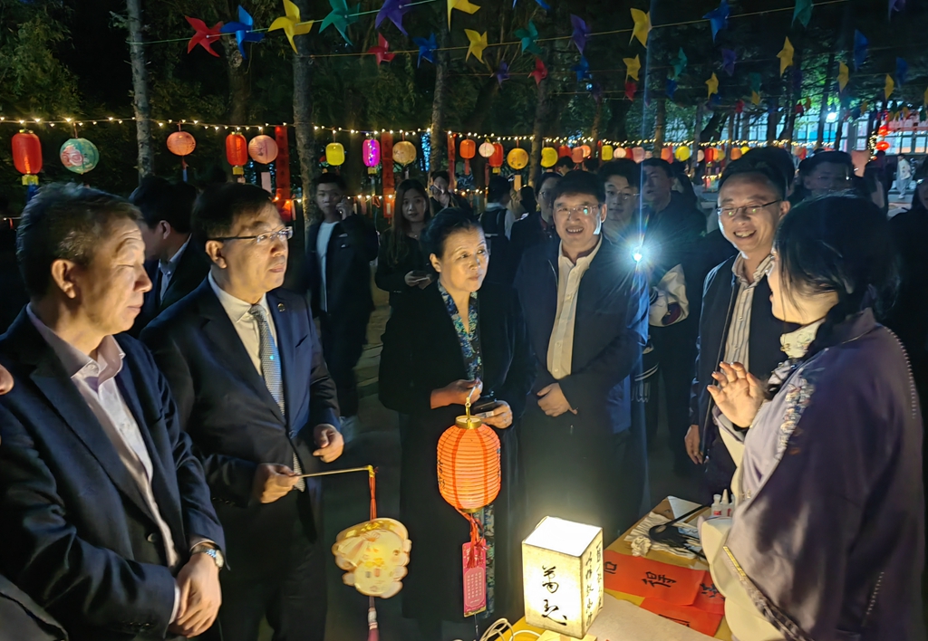 以文化人,以德潤心。本次活動以“花燈映月 情暖齊大”為主題,設(shè)置了妙手生彩華(制作花燈)、紈扇比明月(制作團扇)、慧眼識燈語(猜燈謎)、相思寄鴻雁(寫祝??ǎ┑拳h(huán)節(jié)。同學們或聯(lián)手制作花燈、團扇,或饒有興趣地討論燈謎謎底,或在祝??ㄆ蠈懴铝藢亦l(xiāng)和親人的思念以及對未來的美好期許。通過這種“接地氣”“沉浸式”“自助式”的方式,同學們切身體會到中秋傳統(tǒng)文化,相互交流、分享經(jīng)驗,并在弘揚傳統(tǒng)文化的同時,倍感親情、友情與團圓之美。活動期間,校領(lǐng)導陳桂芝、郝文斌、張文治、叢喜權(quán)、張樹軍及相關(guān)職能部門負責人也參與到游園活動中,與同學們共慶中秋佳節(jié)、共迎國慶華誕、共敘家國情懷!