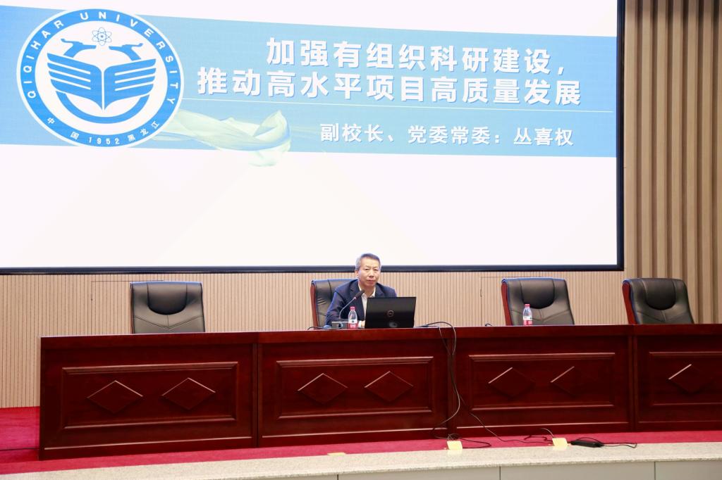 會(huì)上,叢喜權(quán)以“加強(qiáng)有組織科研建設(shè),推動(dòng)高水平項(xiàng)目高質(zhì)量發(fā)展”為題,從學(xué)校高水平項(xiàng)目的基本情況,存在的差距及不足以及下一步工作部署三個(gè)方面對我校高水平項(xiàng)目申報(bào)情況進(jìn)行了介紹。