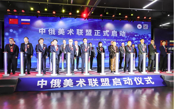 省教育廳副廳長董成、哈爾濱師范大學黨委書記孫立軍、俄羅斯莫斯科國立蘇里科夫美術學院院長阿納托利·柳巴溫、中國國家畫院原院長盧禹舜先后在啟動儀式致辭。哈爾濱師范大學校長蔣鯤宣讀了中俄美術聯(lián)盟宣言和首批聯(lián)盟成員名單。郝文斌與中俄美術聯(lián)盟各方代表共同上臺,觸摸啟動按鈕,點亮象征聯(lián)盟宗旨“自愿、平等、合作、共贏”的光柱,正式啟動中俄美術聯(lián)盟。