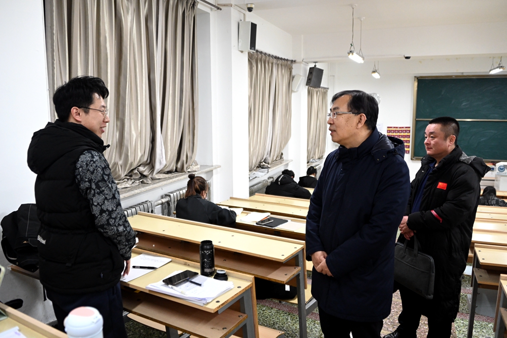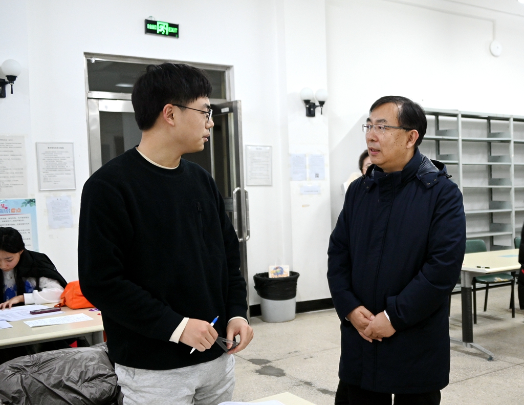12月4日晚,校長郝文斌在教務處等相關部門負責人陪同下,來到學校中區(qū)圖書館、東區(qū)、中區(qū)和西區(qū)教學樓考研自習室,看望準備參加2024年研究生入學考試的學生。