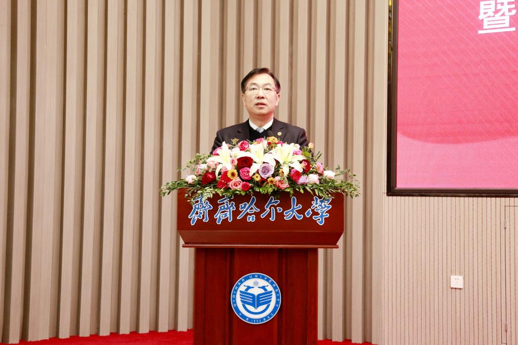 在簽約暨揭牌儀式上,齊齊哈爾大學(xué)校長(zhǎng)郝文斌代表學(xué)校致詞。郝文斌表示,創(chuàng)建“鄉(xiāng)村振興學(xué)院”是深入學(xué)習(xí)貫徹落實(shí)習(xí)近平總書(shū)記關(guān)于實(shí)施鄉(xiāng)村振興戰(zhàn)略的重要論述的務(wù)實(shí)舉措,是深化校地融合、強(qiáng)化協(xié)同發(fā)展,以教育賦能鄉(xiāng)村振興的創(chuàng)新之舉。鄉(xiāng)村振興,教育先行。齊齊哈爾大學(xué)將勇?lián)蠼忄l(xiāng)村與農(nóng)業(yè)發(fā)展重大課題和突出難題的歷史性任務(wù),與齊齊哈爾市持續(xù)深化校地合作,推動(dòng)鄉(xiāng)村振興學(xué)院建設(shè)結(jié)出累累碩果。