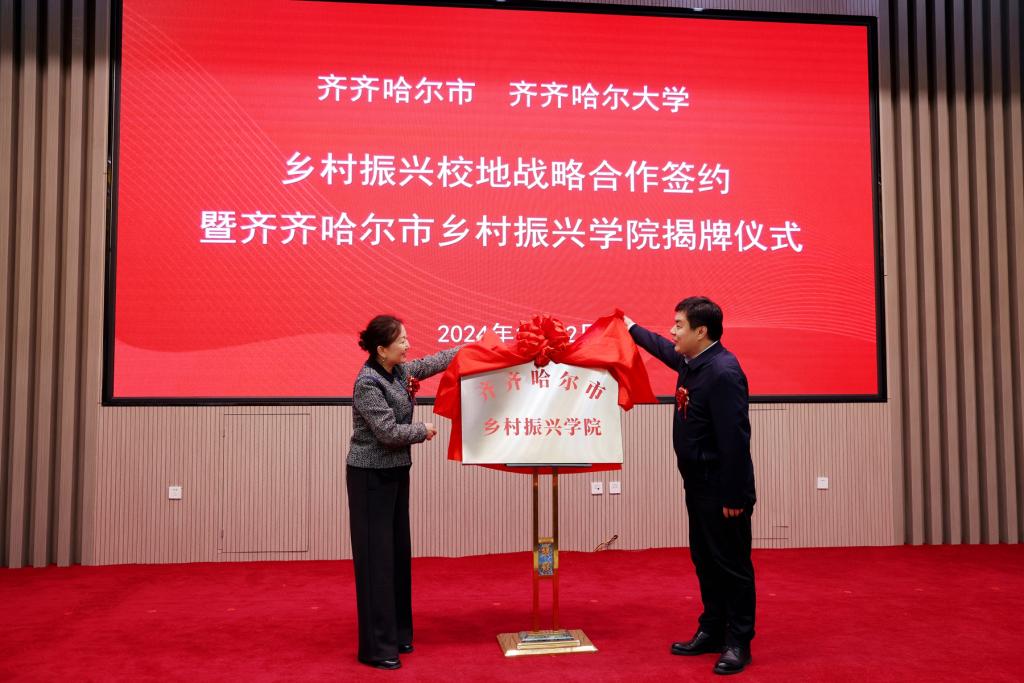 齊齊哈爾大學(xué)黨委副書(shū)記齊宏偉與齊齊哈爾市委副書(shū)記劉振江共同為齊齊哈爾市鄉(xiāng)村振興學(xué)院揭牌。