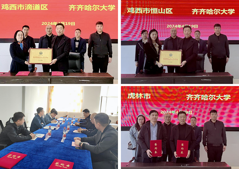 此前,學校分別與雞西市滴道區(qū)、雞西市恒山區(qū)、綏化市、虎林市開展校地合作洽談會并簽署合作框架協(xié)議,并分別授予實習實訓基地、就業(yè)創(chuàng)業(yè)基地、人才工作站牌匾。