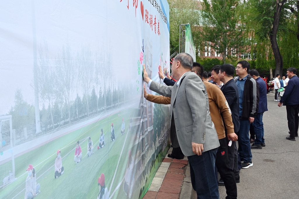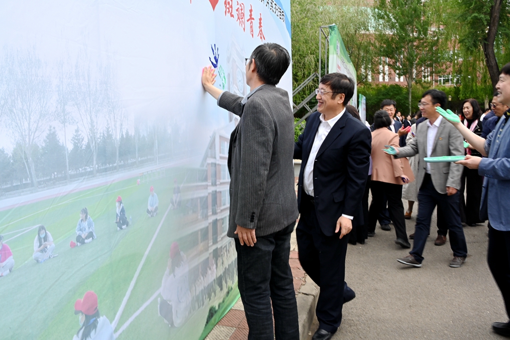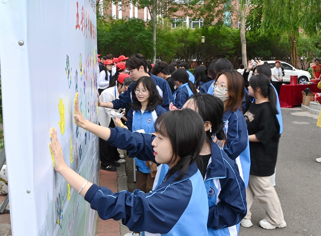 活動開始前,現(xiàn)場的領(lǐng)導(dǎo)、老師和同學(xué)們在“五彩手印,斑斕青春”主題展板上留下心靈印記,描繪青春夢想和希望,簽名記錄美好時光。