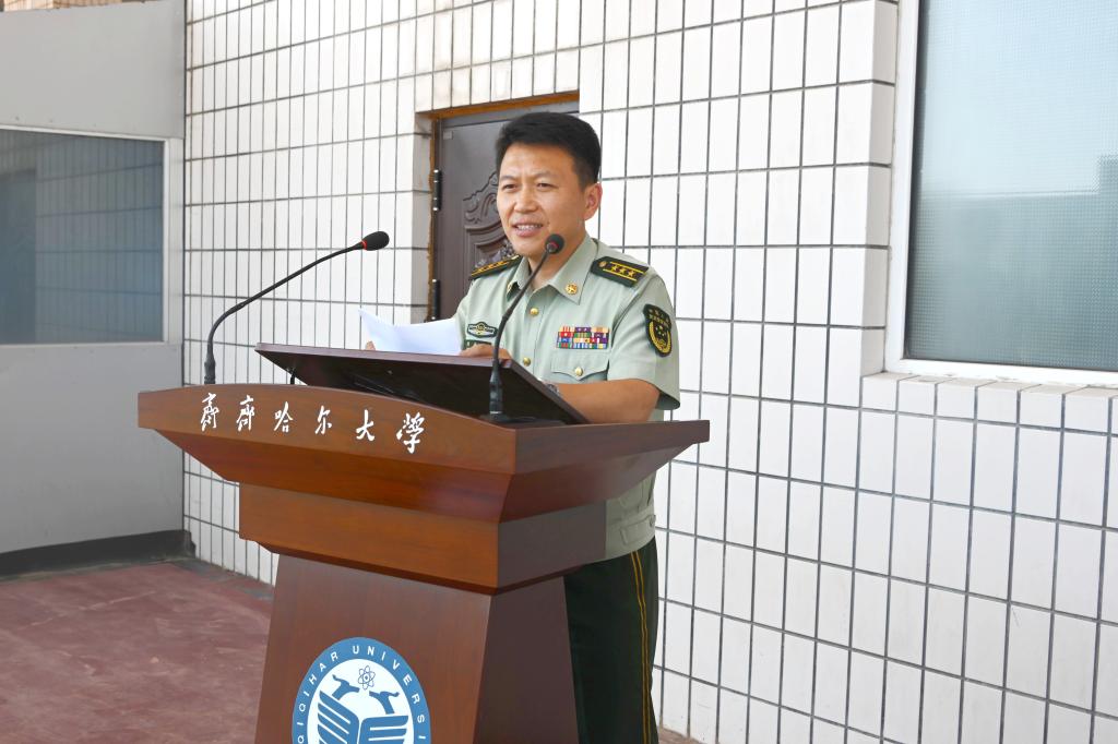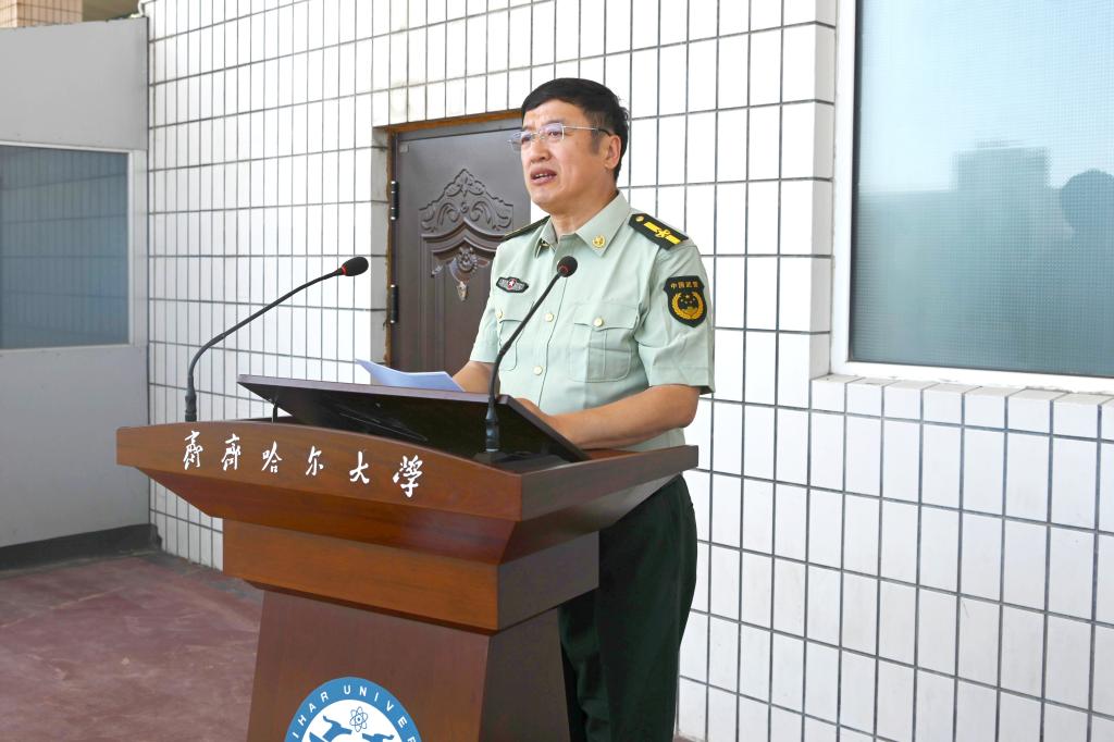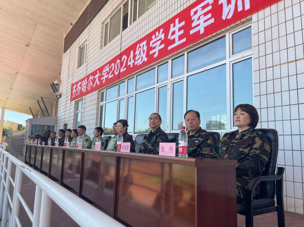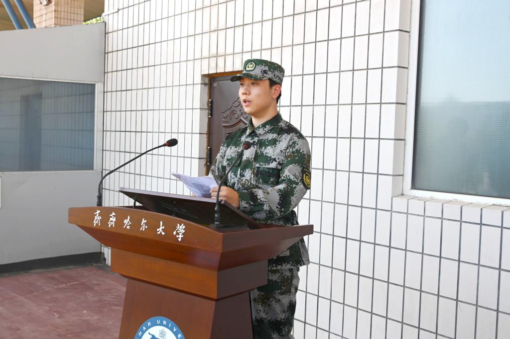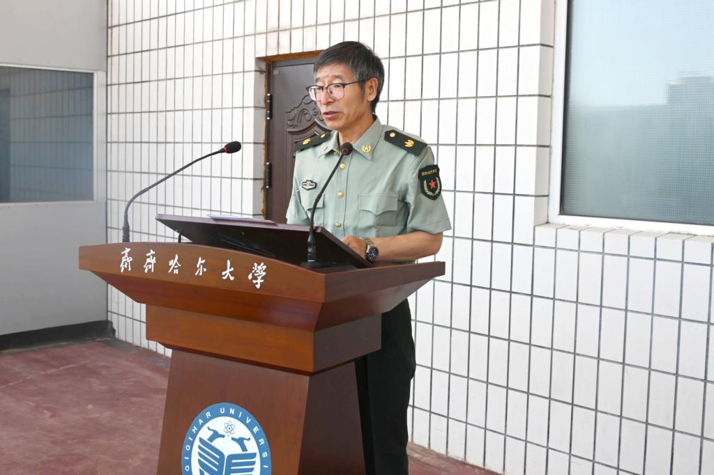 張文治作動員講話,他向承擔(dān)本次軍訓(xùn)任務(wù)的武警齊齊哈爾支隊全體官兵表示熱烈的歡迎,向擔(dān)任軍訓(xùn)任務(wù)的40名自訓(xùn)教官表示衷心感謝,向參加軍訓(xùn)的2024級全體新同學(xué)表示誠摯的慰問。他強調(diào)了大學(xué)生軍事訓(xùn)練的重要性,指出對大學(xué)生軍事訓(xùn)練是貫徹落實《國防教育法》、《兵役法》的基本要求,是全民國防意識的重要體現(xiàn),是立德樹人的重要舉措。他向全體參訓(xùn)師生提出四點希望和要求,一要樹立理想堅定信念;二要服從命令聽從指揮;三要磨練意志鍛煉品質(zhì);四要嚴守紀律鑄就榮譽;五要主動擔(dān)當密切協(xié)同。