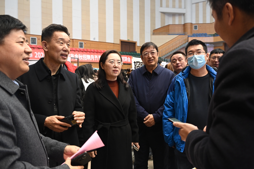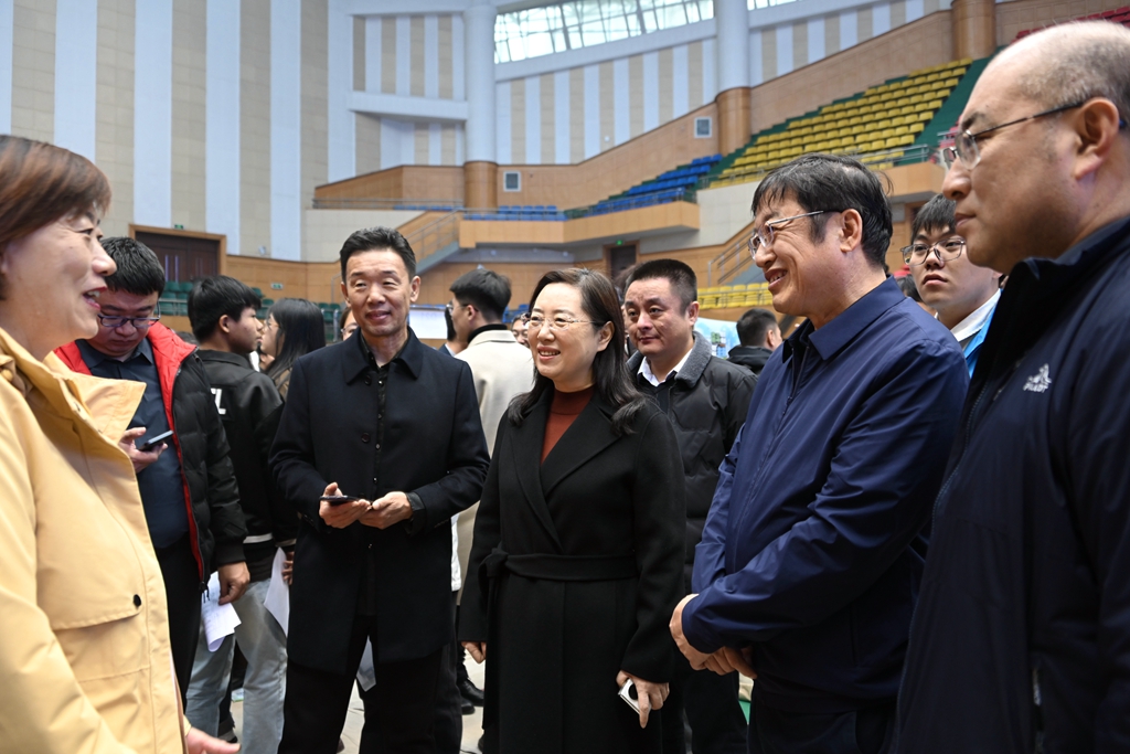 學(xué)校黨委書記丁宏、副書記張文治來到現(xiàn)場,與濱州市濱城區(qū)人社局、齊齊哈爾市人社局、古井集團、黑龍江欣匯龍、山東永鑫能源集團、左思中學(xué)、魯泰紡織等政府部門、用人單位、求職學(xué)生及學(xué)院領(lǐng)導(dǎo)、教師進行交流。