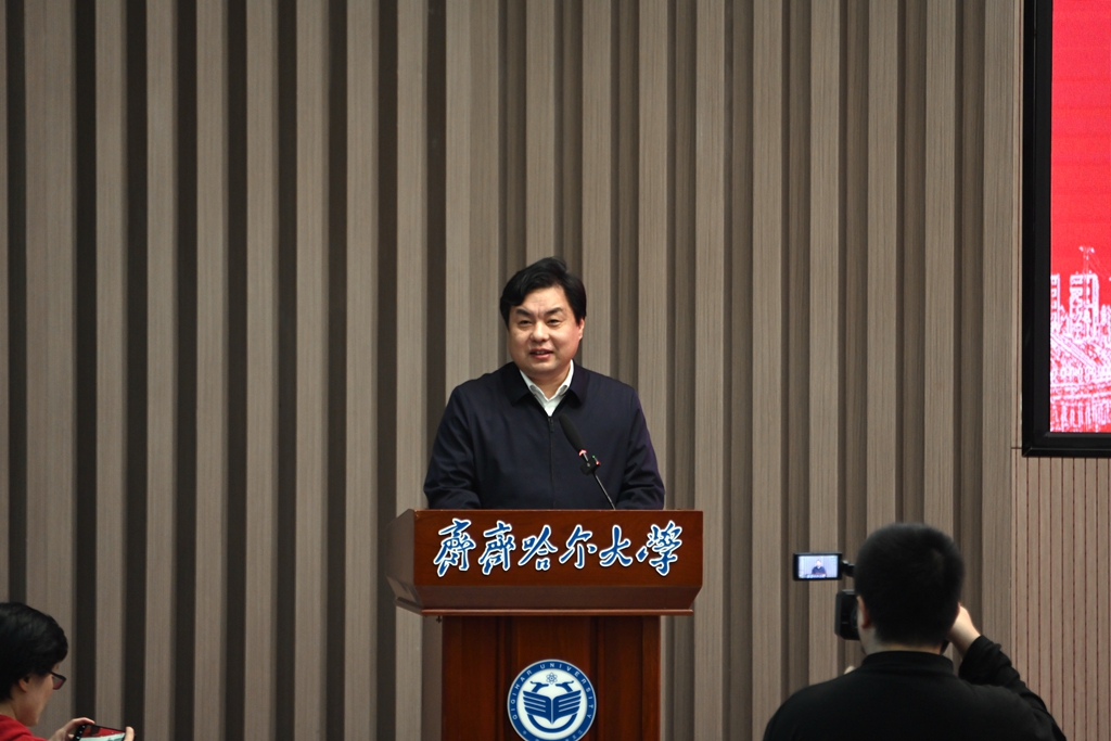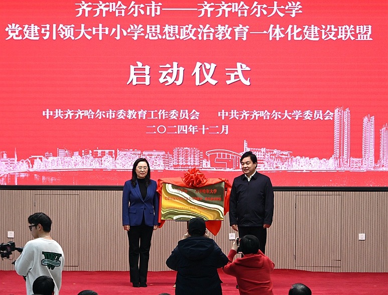 12月10日下午,齊齊哈爾市—齊齊哈爾大學黨建引領大中小學思想政治教育一體化建設聯(lián)盟啟動儀式在日新大廈四樓報告廳舉行。齊齊哈爾市委副書記、市委教育工委書記劉振江,齊齊哈爾市副市長高淑春,我校黨委書記丁宏,校長、黨委副書記郝文斌,黨委副書記齊宏偉,黑龍江省民宗委文化宣傳教育處處長吳鵬,齊齊哈爾市教育局局長、市委教育工委副書記姜林出席儀式。儀式由校黨委副書記張文治主持。