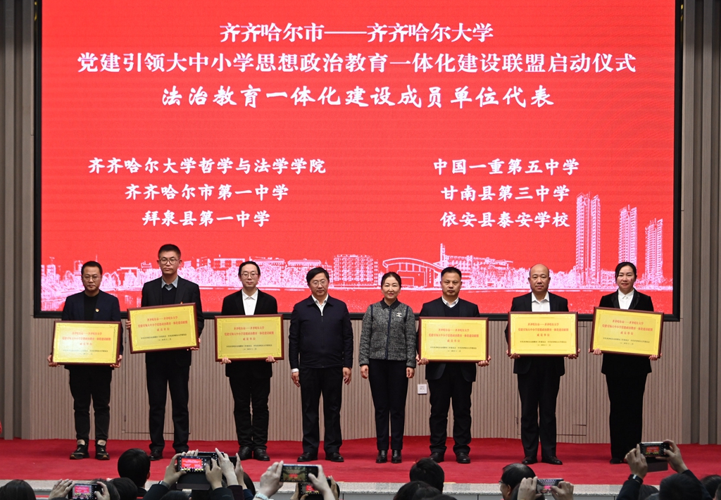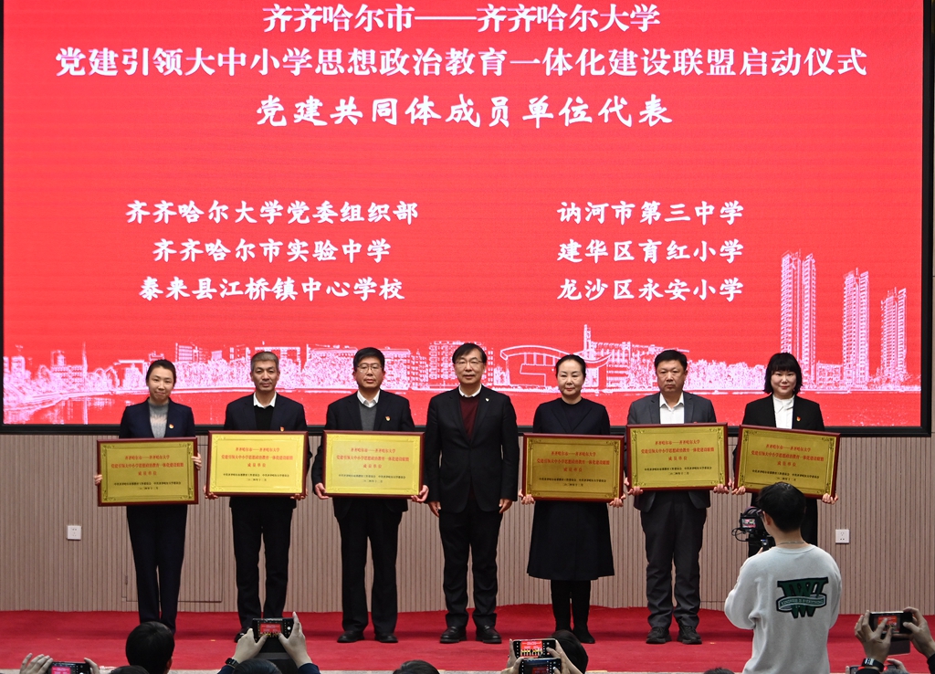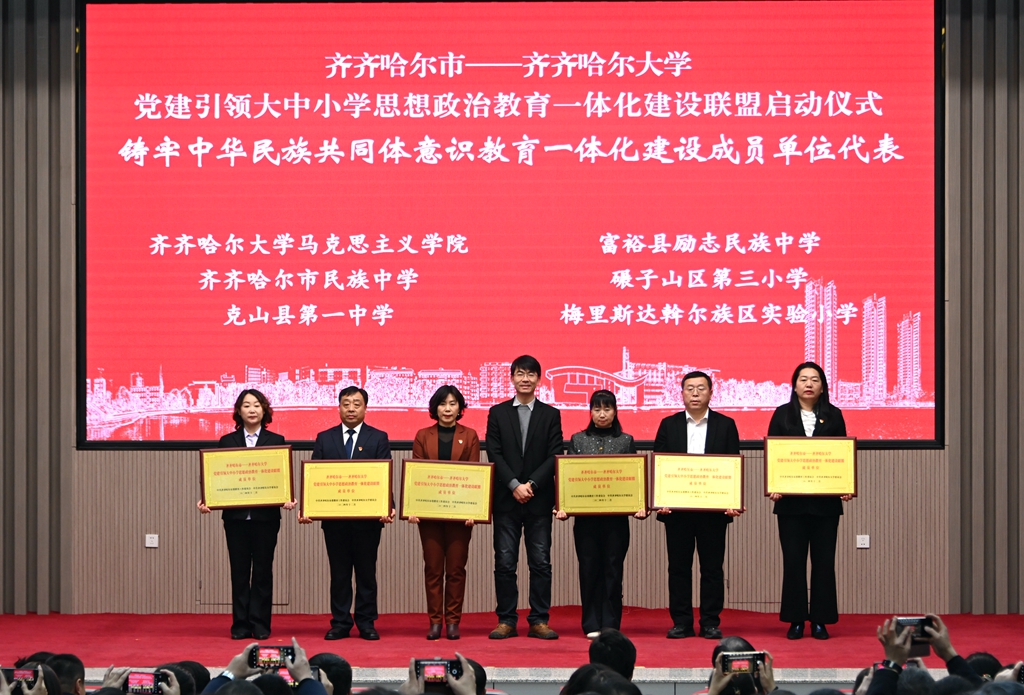 與會領導分別為“齊齊哈爾市—齊齊哈爾大學黨建引領大中小學思想政治教育一體化建設聯(lián)盟”成員單位代表授牌。