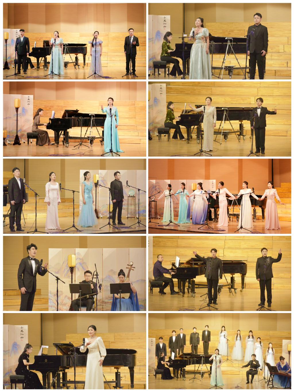 《錦瑟》《更漏子·玉爐香》《虞美人·春花秋月何時了》《破陣子·為陳同甫赴壯詞以寄之》《越人歌》《青玉案·元夕》《山之高》《江畔獨步尋花》《念奴嬌·赤壁懷古》《葬花吟》《秋風詞》《蝶戀花·檻菊愁煙蘭泣露》,一首首大家耳熟能詳的古詩詞作品配上一段段優(yōu)美動聽的旋律,以獨唱、重唱、合唱的形式相繼在音樂廳里徐徐上演,古與今、詩與歌、音與畫和諧交融,令觀眾們在古詩詞與音樂交相輝映的意境之中陶醉不已。