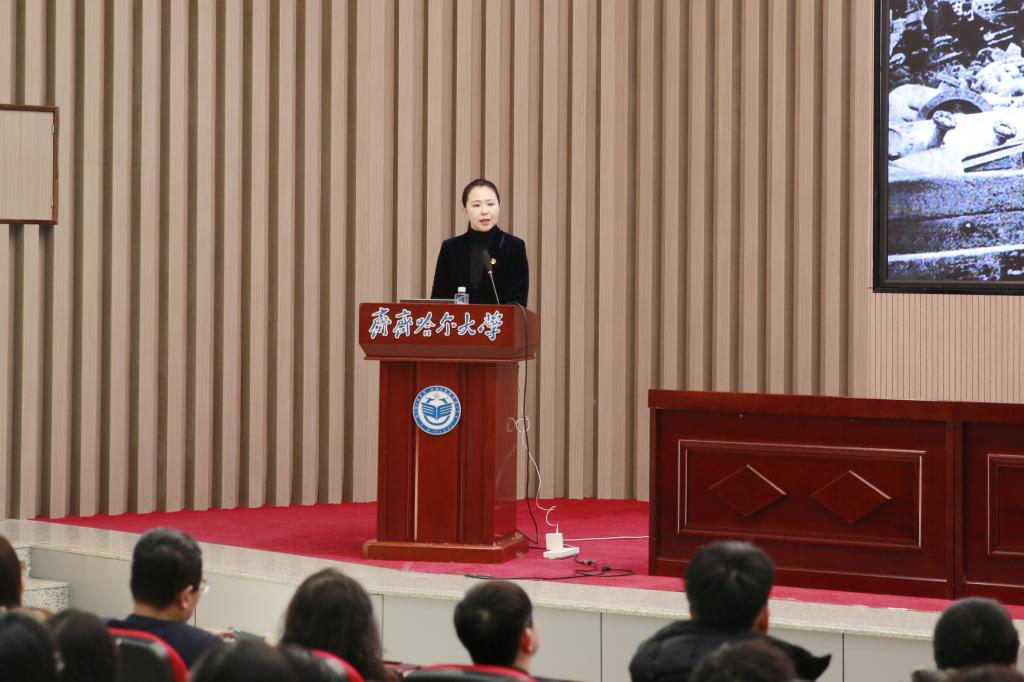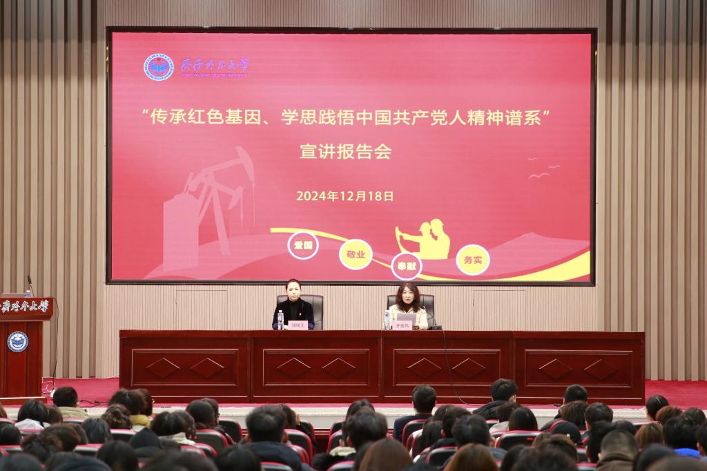 宣講報(bào)告會(huì)由全國高校“中國共產(chǎn)黨人精神譜系”宣講團(tuán)成員、全國紅色旅游五好講解員、石油魂宣講團(tuán)首席宣講員、鐵人王進(jìn)喜紀(jì)念館宣教部主任鄭媛元主講。她以《石油魂——石油精神和大慶精神、鐵人精神》為題,通過大量的歷史圖片、珍貴的影像資料和生動(dòng)的語言,詳細(xì)講述了大慶石油會(huì)戰(zhàn)的整個(gè)過程以及在這個(gè)過程中形成的大慶精神、鐵人精神,深入分析了大慶精神、鐵人精神的豐富內(nèi)涵和時(shí)代價(jià)值,科學(xué)闡述了在新時(shí)代新征程傳承弘揚(yáng)大慶精神、鐵人精神的實(shí)踐路徑。宣講報(bào)告內(nèi)容豐富、例證詳實(shí),既有理論闡釋、又有感人事跡,既有思想深度、又有教育溫度,對全校廣大黨員、干部、師生更好地傳承紅色基因、賡續(xù)紅色血脈具有很強(qiáng)的指導(dǎo)性和啟發(fā)性。