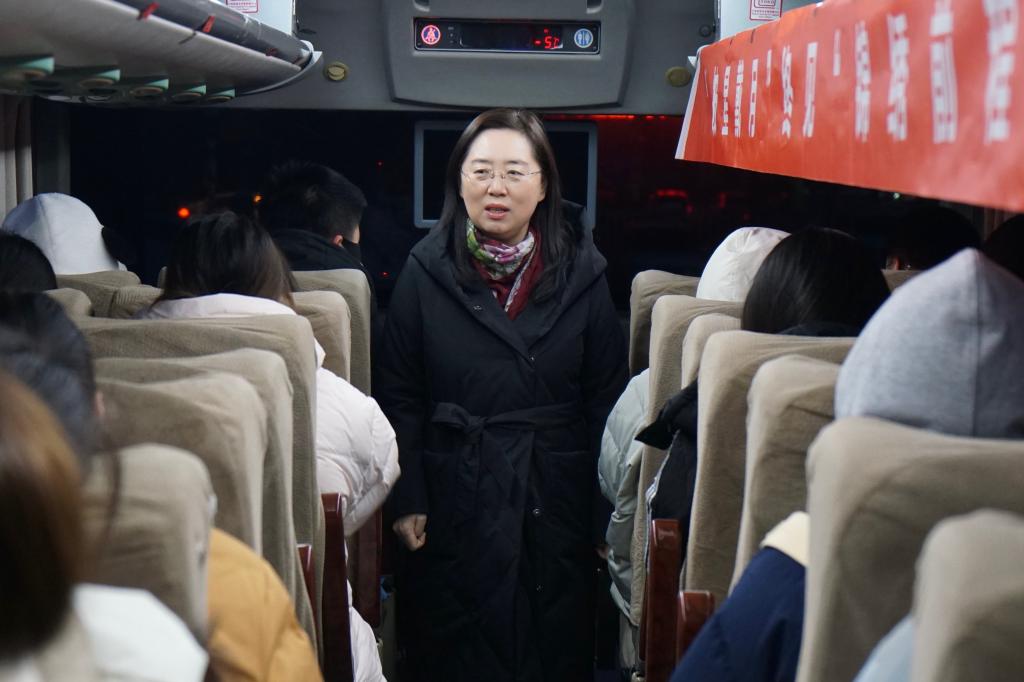 發(fā)車前,校黨委書記丁宏,校長、黨委副書記郝文斌,黨委副書記張文治親臨現(xiàn)場,為即將踏上征程的學子們加油鼓勁,送上最誠摯的祝福與深切的期望。校領導們走上大巴車,與學子們親切交流,鼓勵大家保持平和心態(tài),全力以赴,發(fā)揮出最佳水平。車廂內(nèi),笑聲與感動交織,考生們的臉上洋溢著自信與幸福的笑容,這份來自母校的溫暖,為他們的緊張心情增添了安定與力量。
