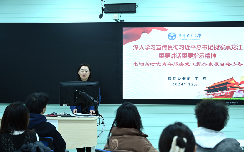 為深入貫徹落實(shí)《關(guān)于深化新時(shí)代學(xué)校思想政治理論課改革創(chuàng)新的若干意見》,切實(shí)提升學(xué)校思政課凝心鑄魂育人實(shí)效,12月20日下午,學(xué)校黨委書記丁宏在11教408教室以《深入學(xué)習(xí)宣傳貫徹習(xí)近平總書記視察黑龍江重要講話重要指示精神——書寫新時(shí)代青年服務(wù)龍江振興發(fā)展合格答卷》為題,為美術(shù)與藝術(shù)設(shè)計(jì)學(xué)院2024級(jí)繪畫專業(yè)30余名師生講授思政課。