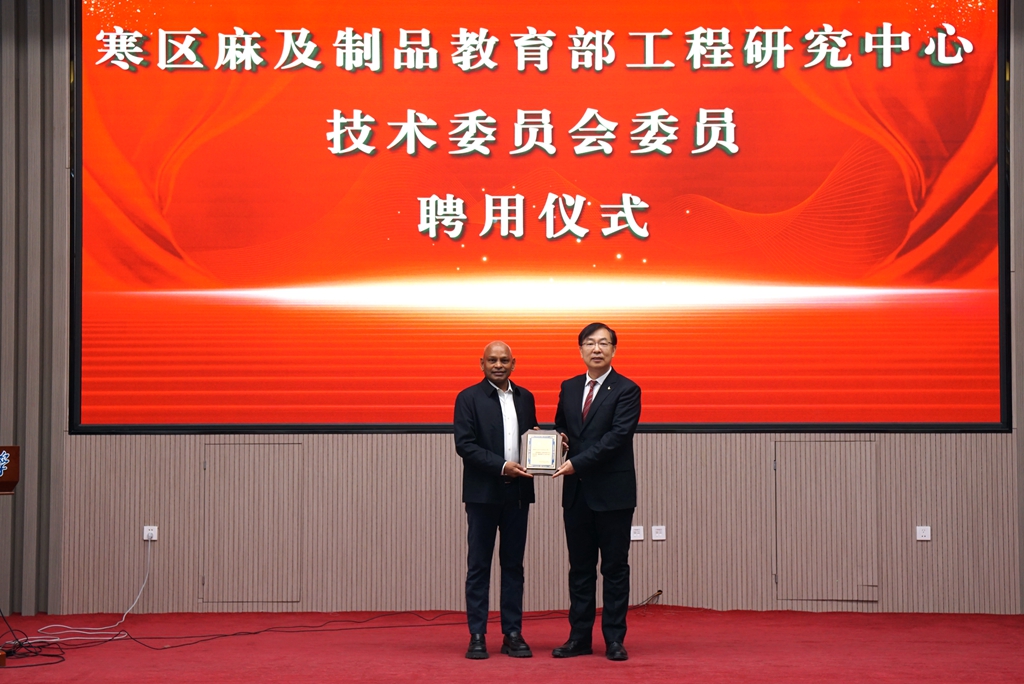 在聘任儀式上,校長郝文斌代表學校發(fā)表致辭,并為西拉姆院士頒發(fā)聘任證書。他表示,西拉姆院士的受聘不僅為寒區(qū)麻及制品教育部工程研究中心注入了國際化的學術視野,也將在新型紡織材料的功能化開發(fā)、先進制造工藝的優(yōu)化及可持續(xù)技術的應用等方面提供強有力的學術支撐。依托西拉姆院士的前沿學術理念和豐富科研經(jīng)驗,寒區(qū)麻及制品教育部工程研究中心將在科研能力提升、學科建設優(yōu)化及產(chǎn)學研合作深化等方面持續(xù)探索,積極推動跨學科融合,拓展新型紡織材料的研究方向。同時,寒區(qū)麻及制品教育部工程研究中心將加強科技創(chuàng)新,推動關鍵技術的發(fā)展與應用,促進創(chuàng)新成果的高效轉化,不斷提升學校在相關領域的學術影響力和技術創(chuàng)新能力,為學科建設和行業(yè)發(fā)展作出更大貢獻。